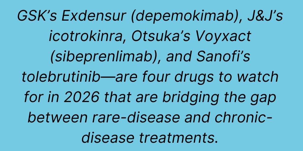Clarivate points to four drugs—GSK’s Exdensur (depemokimab), J&J’s icotrokinra, Otsuka Pharmaceutical’s Voyxact (sibeprenlimab), and Sanofi’s tolebrutinib—as four drugs to watch for in 2026 that are bridging the gap between rare-disease and chronic-disease treatments.