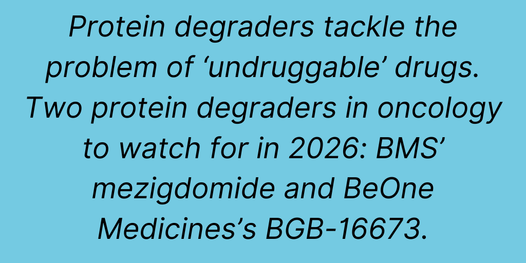 One of the ongoing areas of drug development is to tackle so-called “undruggable” drugs, which refers to certain disease-associated proteins that lack traditional binding pockets, thereby making them highly difficult to target with conventional small-molecule drugs. Targeted protein degradation, which uses the cell’s innate protein degradation mechanisms to selectively down-regulate or eliminate pathogenic proteins, is a promising area to address that problem. Clarivate points to two protein degraders in oncology to watch for in 2026: BMS’ mezigdomide and BeOne Medicines’s BGB-16673.