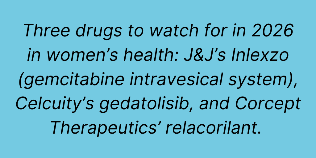 Women’s health, which encompasses not only female-specific conditions but also health conditions disproportionately affecting women or affecting women differently than men, is another important area of growth for the bio/pharma industry. Clarivate points to three drugs to watch for in 2026 in women’s health: J&J’s Inlexzo (gemcitabine intravesical system), Celcuity’s gedatolisib, and Corcept Therapeutics’ relacorilant.
