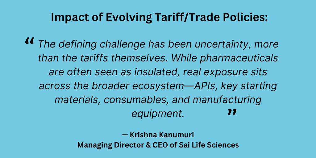 Kanumuri (Sai Life Sciences): The defining challenge has been uncertainty, more than the tariffs themselves. While pharmaceuticals are often seen as insulated, real exposure sits across the broader ecosystem—APIs, key starting materials, consumables, and manufacturing equipment. What the industry needs is clarity: what is in scope, how country of origin will be determined across multi-country supply chains, whether different tariff regimes can stack, how durable exclusions will be, and how US manufacturing is defined when production is carried out through CDMOs. These points materially influence long-term supply-chain design and investment decisions.