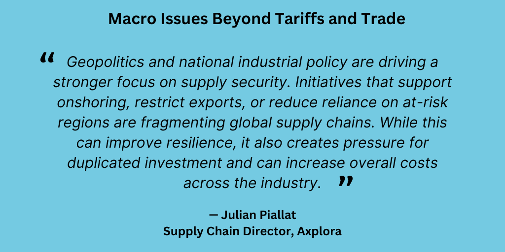 Geopolitics and national industrial policy are driving a stronger focus on supply security. Initiatives that support onshoring, restrict exports, or reduce reliance on at-risk regions are fragmenting global supply chains. While this can improve resilience, it also creates pressure for duplicated investment and can increase overall costs across the industry.