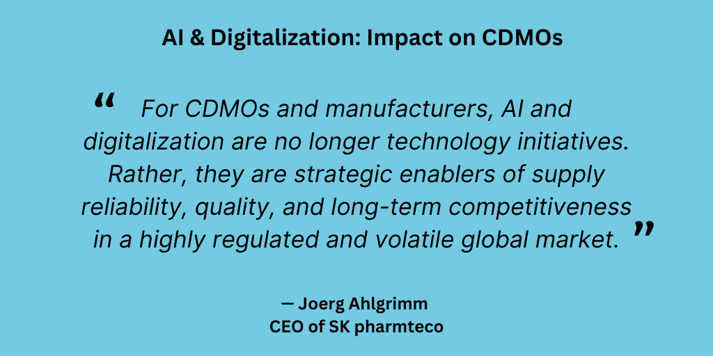 Ahlgrimm (SK pharmteco): For CDMOs and manufacturers, AI and digitalization are no longer technology initiatives. Rather, they are strategic enablers of supply reliability, quality, and long-term competitiveness in a highly regulated and volatile global market